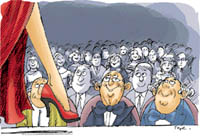 Oysa jüri üyesinin 15 dakikalık şöhreti sadece 30 saniye sürer: "Bay/Bayan Falan Feşmekan, Carcurt kurumunun bilmemne 2. başkanı" dendiğinde, ne çok geç, ne çok erken, doğru zamanlamayla hafifçe doğrulmanız, seyirciye (ne sağ, ne sol sırayı unutmadan) başınızı belli belirsiz eğerek selam vermeniz, bu esnada çok yılışmadan zarifçe gülümsemeniz, daha da önemlisi asla objektiflere bakmamanız, bir de işi uzatmamanız, ama çok da kısa kesmemeniz gerekmektedir.
