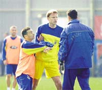 F.Bahçeli futbolcular, derbi maçın hazırlıklarına dün Samandıra'da başladı. Gergin idmanda Andersson ile Recep, çift kale maç sırasında birbirlerine girdiler. Bir hava topu sırasında, Andersson'un dirseği Recep'e geldi. Buna sinirlenen Recep, İsveçli futbolcuyu beline sarılıp itmek isteyince ortalık karıştı. Andersson yumruk atmaya çalışırken, teknik direktör Lorant araya girip iki futbolcuyu barıştırdı.
