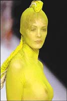 Londra'daki St.Martin's College öğrencilerinin tasarımlarını sergileyen modellerin bütün vücutları ince külotlu çoraplarla sarılmış. Naylon çoraba transparan kıyafet süsü veren genç tasarımcılar, akıllara durgunluk veren bu yaratıcılıklarıyla kadınları başına daha çok çorap öreceğe benziyor!