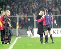 G.Saray Teknik Direktörü Lucescu, dün sahadan çıkmadı! Liverpool maçı sonrasında, "Artık futbolcularıma vurmayın" diyerek sert futbola isyanını dile getiren Romen teknik adam 16. dakikada İsmail Güldüren'in Perez'e yaptığı faulde sahaya daldı. İlerleyen dakikalarda bu kez Ömer, Berkant'a faul yaptı. Lucescu, yine sahadaydı. Hakem, Ömer'e de sarı kart çıkarırken, teknik alanı ihlal eden Lucescu'ya gülmekle yetindi. Romen hoca G.Birliği'ne verilen penaltıya itiraz etmek için de çizgiyi geçti ama bu kez zamanında durduruldu