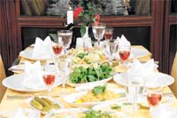 Önce soğuklar geldi. Balık mezeleri ve salatalar desek belki daha doğru olacak. Uskumru marine, lakerda, balık dolma, balık pastırması ve levrek sarma... Burada istemeden levrek sarmaya biraz torpil geçeceğiz. Çünkü lezzetine doyamadık. Efendim, ilk önce karidese dil peynirini sarıyorlar. Elde edilen ikiliyi levrekle buluşturuyorlar ve bu birlikteliği krema ve kapari ile sosluyorlar. Sonuç muhteşem oluyor.