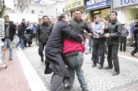 Kapkaç olayları nedeniyle yapılan protesto gösterisinde kalabalıktan yararlanarak yaşlı bir adamın cüzdanını çalmak isteyen hırsız esnaf tarafından coplarla dövüldü; "Polis yok mu?" diyerek yardım isteyen yankesici, polisin müdahale etmesi sonucu kaçarak kayıplara karıştı. Kapkaç nedeniyle müşterilerinin azalmasını protesto etmek isteyen Kadıköy esnafı dün çarşı içinde bir eylem yaptı. Yaklaşık 30 esnaftan oluşan grubun eylemi sırasında kalabalıktan yararlanan bir yankesici, 70 yaşındaki İhsan Eroğlu'nun cüzdanını almaya çalıştı. Son anda fark edilen kimliği belirsiz hırsız, karşısında kalabalık esnaf grubunu buldu. Kapkaça karşı öfkeyle dolu olan esnaf, cop ve tahta parçalarıyla hırsızı evire çevire dövdü.