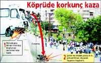 Köprüden geçerken rot aksamı kırılan minibüs parmaklıklara çarpıp havada asılı kaldı. Önde oturan yolcu ile şoför 8 metreden uçarak asfalta çakıldı