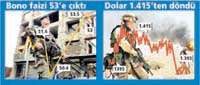 Faizlerde yaşanan yükseliş bu beklentinin kırılmasına neden oldu. 7 Temmuz vadeli bonoların faizi dün yüzde 53.5 bileşiklere çıktıktan sonra günü yüzde 53 düzeylerinden tamamladı. Bu artışla faizler bir günde 2.5 puan birden yükseldi. Faizlerde yaşanan 2.5 puanlık yükseliş bankaların fonlama bileşiğini de yüzde 42.5'e çıkardı. Merkez Bankası'nın gecelik borçlanma faizi ise 40.7'ye yükseldi. Eurobond piyasasında da 30 yıllık Türk tahvilleri 105 dolardan 102 dolara geriledi.