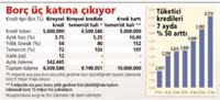 Merkez Bankası'nın verilerine göre, sistemde yılın 7 ayında bireysel kredi tutarı yüzde 50 oranında arttı. Ekonomide yaşanan canlamanın büyük etkisinin olduğu bu sıçramaya tüketicinin kredi kartı borçlarını kapamak için bireysel krediye başvurmaları da etkili oldu. Özellikle Yeni Tüketici Yasası'nın yürürlüğe girdiği 14 Mart'tan sonra tüketici kredilerindeki artış oldukça hız kazandı. Mart başı itibariyle 3.2 katrilyon liralık tüketici kredisi kullandıran bankalar, bu rakamı ağustos başı itibariyle 4.4 katrilyon liraya çıkardı.