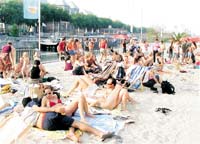 Sicaktan bunalan Brukselliler bir kilometrelik kanal boyunca uzanan yapay plajda gunesleniyor. Plajda guneslenmek serbest ama suya girmek kesinlikle yasak