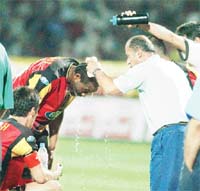 G.Saraylı futbolcular "Sıcaktan boğazımız kurudu" diye yakınınca, Terim "Gerekirse başınızdan su dökerim" dedi