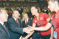 Voleybolcularin basarisina kayitsiz kalmayan Erdogan salondaydi. Basbakan mac sonrasi sahaya inip oyunculari tek tek kutladi