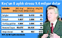 Yeniden yapılanan Irak'la ticarete büyük önem verdiklerini ifade eden Özaydınlı, Aygaz ve Opet'in bu ülkeye yönelik 200 milyon dolarlık bir ihracat anlaşması imzaladığını söyledi. Özaydınlı, "Bu ihracatın 140 milyon dolarlık kısmı gerçekleştirildi" dedi. Grubun lokomotif şirketlerinden Ford Otosan'ın 8 aylık üretiminin yüzde 258, iç satışlarının yüzde 124, ihracatının ise yüzde 383 arttığına işaret eden Özaydınlı, "Ford'un yılsonu ihracat hedefi 740 milyon Euro. Tofaş'ın ise 720 milyon Euro. Önümüzdeki yıl Belçika'dan transfer edilecek Transit üretimi ile hedefimiz 1.5 milyar Euro'luk ihracatı yakalamak" diye konuştu. Özaydınlı, Arçelik'te ise 2003 yılı sonu konsolide ciro hedefinin 1.9 milyar dolara ulaşacağını söyledi.