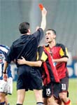 G.Saray'ın yıldız oyuncusu Hasan Şaş, kırmızı kart görmeye alıştı. Olimpiyat Stadı'ndaki Fenerbahçe maçında oyundan atılan Hasan, dün de kendisine sert giren Alkiza'nın cezasını kendisi vermeye kalkınca kırmızı kartı gördü. 82. dakikada Alkiza, Hasan'a arkadan oldukça sert girdi. Hemen yerden kalkan G.Saraylı oyuncu da rakibinin boynundan iterek yere düşürdü. Hakem de hiç tereddütsüz kırmızı kartını çıkardı. Alkiza da yaptığı faul nedeniyle sarı kart gördü. F.Bahçe maçı sonrası ligde bir maç ceza alan ve Adana'da oynamayan yıldız futbolcunun, Şampiyonlar Ligi'nde de iki maç ceza alması gündemde.