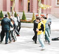 Olasi asker gonderme kararini protesto etmek isteyen bir grup ogrenci Basbakanligin duvarina kan kirmizisi boya doktu. Bakanlar Kurulu toplantisinin devam ettigi sirada, uzerinde, "Ozgur Genclik" yazan onluk giyen ikisi kadin, ucu erkek 5 eylemci guvenlik gorevlilerini atlatarak Basbakanligin onune geldi. Eylemciler, "ABD askeri olmak istemiyoruz", "Tezkereye Hayir", "Parayla asker kani satilmaz" sloganlari atarak sise icindeki kirmizi boyalari duvara ve yerlere doktu. Korumalarin mudahalesi ile gozaltina alinan eylemciler hemen bina onunden uzaklastirilirken, kani andiran boyalar gorevliler tarafindan yikanarak temizlendi. Savas karsitlari platformu da eylem alani olarak TBMM ve AKP'yi secti. Platform, bugun AKP Genel Merkezi'nde, 8 Ekim'de de Meclis'te eylem yapacak.