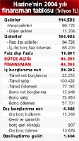 Hazine, 2004 yılında konsolide bütçe kapsamında iç piyasadan tahvil ihracı yoluyla 100.4 katrilyon lira, bono ihracı yoluyla da 73.6 katrilyon lira olmak üzere toplam 174 katrilyon lira borçlanmaya gidecek. Hazine'nin açıkladığı rakamlara göre toplam 194 katrilyonluk iç borç anapara ve faiz ödemelerine karşık, 172 katrilyon liralık borçlanma üzerinden borç çevirme oranı (roll over ratio) yüzde 89.7'ye denk geliyor.