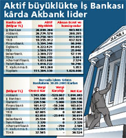 Aktif büyüklük açısından ise geçen yıl dokuz aylık bilançolarında toplam 95.6 katrilyon liralık aktif büyüklük rakamı açıklayan İMKB'de işlem gören bankalar bu yılın ilk dokuz ayında bu rakamı 15 katrilyonun üzerinde artırarak 111 katrilyona çıkardı. Aktif büyüklük sıralamasında 26.8 katrilyon lira ile İş Bankası ilk sırada yer alırken, onu 26.7 katrilyon lira ile Akbank izledi.