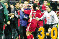 Kirmizi-siyahli takimda sakatliklari olan Youla, Erkan, kaleci Gokhan ve kaptan Umit Bozkurt yoktu. Ama sahada ari gibi calisan, varini yogunu ortaya koyan 11 aslan vardi. Oyuna kontrollu basladik. Lizbon seyirci destegini arkasina alarak kalemizde baski kurdu. Fakat gol bizden geldi. 45.dakikada Ali Tandogan'in muhtesem frikigi aglarla bulustugu zaman statta derin bir sessizlik olustu 1-0.