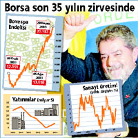 Brezilya ekonomisi toparlanıyor. Bu yılın başında göreve gelen sendika liderliğinden gelme sosyalist Devlet Başkanı Luiz Inacio Lula da Silva, gerçekleştirdiği ekonomik ve sosyal reformlarla ülkesini düzlüğe çıkarmak için önemli adımlar attı. Her geçen gün iyiye giden Brezilya ekonomisi yatırımcılar tarafından da beklenen olumlu sinyaller vermeye başladı. Borsa son 35 yılın en yüksek seviyesine ulaşırken, sanayi üretiminde de artışlar gözleniyor. Sao Paulo Borsası'nın Bovespa Endeksi yüzde 1.12 artış gösterek 20 bin seviyesine ulaştı. Son 9 haftadır yükselişte olan borsada yılbaşından bu yana yüzde 79 değer kazandı. Bütün bu olumlu göstergelerin nedeni ise Brezilya Merkez Bankası'nın gelecek ay faiz indirimine gidecek olması.