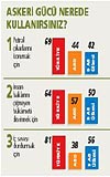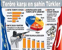 TERÖRE DEMİR YUMRUK Türkler'in yaklaşık yüzde 60'ına göre barışı sağlamanın yolu "askeri güç"ten geçiyor. Terör örgütleri ve terörle mücadele konusunda "askeri yöntemler ve harekat" gerektiğine inanananların yer aldığı istatistikte, yine ülkemiz birinci.