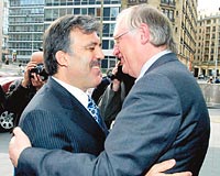 AB Ara Zirvesi'ne katılmak üzere Brüksel'e gelen Dışişleri Bakanı ve Başbakan Yardımcısı Abdullah Gül, Türkiye'nin AB Kopenhag kriterleri konusunda üzerine düştüğünü yaptığını belirterek, "Teorik olarak hala herşey mümkün. Eğer şaka yaptık demezlerse müzakerelerin 2005 yılında başlayacağına inanıyorum. Türkiye'nin AB'ye katılımı gibi böyle büyü bir projede bir ay önce yada bir ay geç çok fark etmez. 2005 yılı içerisinde net, temiz ve hilesiz bir müzakere tarihi bekliyoruz" dedi. AB Komisyonu Genişlemeden Sorumlu Üyesi Günter Verheugen'le görüşen Gül, kendisini kapıda karşılayan ve çıkışta arabasına kadar eşlik eden Verheugen'le yine samimi pozlar verdi.