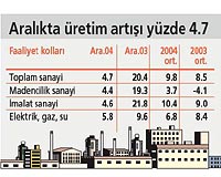 Devletİstatistik Enstitüsü (DİE), ekonomik büyümenin öncü göstergelerinden olan toplam sanayi üretiminin Aralık 2004'te önceki yılın aynı ayına göre yüzde 4.7 arttığını bildirdi. Toplam sanayi üetimi artışı Aralık 2003'te yüzde 20.4 olmuştu. Aralık ayı verilerinin ardından toplam sanayi üretiminde 2004 yılındaki ortalama artış 2003'e göre yüzde 9.8 oldu. Önceki yılın ortalaması ise yüzde 8.5 olmuştu. Reuters'ın 17 banka ve aracı kurum ekonomistinin katılımıyla yaptığı ankette, 2004 yılının tamamı için verilen tahminlerin ortalaması ise yüzde 9.79 olmuştu.
