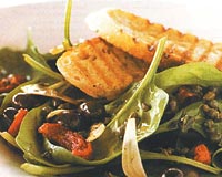 Ispanak yapraklarını ve domatesleri servis tabağına yerleştirin. Ekmeklerin üzerine biraz zeytinyağı sürüp, ızgarada her iki yüzünü de altın rengi oluncaya kadar kızartın. Bir kapta yağı orta hararette ısıtıp, sarmısağı rengi hafif değişene kadar yaklaşık 1 dakika soteleyin. Kapari, zeytin, limon suyu, kekik ve karabiberi de katarak, karışımı 1 dakika daha ısıtın. Ilık sosu salatanın üzerine dökün, ekmeklerle birlikte servis yapın.