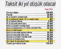 YÜZDE 75'İ KREDİLENDİRİLİYOR Örneğin 100 bin YTL'lik konutu alan vatandaş bunun 25 bin YTL'sini peşinat olarak verecek. Geri kalan 75 bin YTL'yi Ziraat Bankası kredi ile finanse edecek. Banka ilk yıl tutarın yüzde 30'unu yani 22 bin 500 YTL kredi verdiği için o yıl vatandaş 382 YTL'lik taksitlerle borcunun 4 bin 580 YTL'sini ödeyecek. Geri kalan 17 bin 900 YTL ile bankanın ikinci yıl verdiği 26 bin YTL (Yüzde 30) kredinin toplamı olan 44 bin 420 YTL vatandaşın bankaya 2. yıl toplam borcu olacak. İkinci yıl taksit ödemesi ise 853 YTL olacak. İkinci yıl sonunda ödenecek olan 10 bin 236 YTL toplam borçtan düşülecek ve vatandaşın bankaya 34 bin 184 YTL borcu kalacak. Üçüncü yılda banka yine 26 bin 500 YTL son kredi dilimini verecek. Toplam borç 60 bin 684 YTL'ye çıkacak. Vatandaşın taksidi ise geri kalan 8 yılda aylık 1.223 YTL olacak. Vatandaş bankaya toplamda 132 bin 224 YTL ödeyecek. Oysa kişi normal kredi almış olsaydı yüzde 1.30 faiz oranı ile 75 bin YTL'lik 10 yıl vadeli kredi için toplamda 166 bin 320 YTL ödeyecekti. Böylece yeni krediyi alanlar hem başlangıçta düşük taksit ödeyecek hem de 34 bin 96 YTL kâr etmiş olacak.