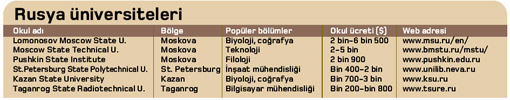 İngilizce seçenekler artıyorFarklı bir ülkede, farklı bir dilde, dünya standartlarında eğitim almak isteyenler için Rusya yeni bir seçenek. Ülkedeki birçok üniversite uluslararası standartlarda eğitim sunuyor. Bunların birçoğu da YÖK denkliğine sahip... Rusya genelinde kamuya ait yaklaşık 600, özel teşebbüse ait de 300 yüksek öğrenim kurumu eğitim veriyor. Okulların çoğu Avrupa veya Amerika okullarıyla anlaşmalı çalıştığı veya uluslararası okul birliklerinin üyesi olduğu için çift diploma verebiliyor. Diğerlerinin diplomaları da yurtdışında tanınıyor.