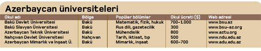 Azerbaycan'ın en büyük avantajı, üniversite fiyatlarının düşük olması. Konaklama fiyatları ise o kadar az değil. Bu ülkede iyi bir semtte oturmanın aylık bedeli 250 dolar. Diğer Orta Asya ülkelerinde olduğu gibi Azerbaycan'daki üniversitelere gitmek isteyen öğrencilerin de yapacağı tek şey, YÖK'ün denklik birimini arayıp, gitmek istediği üniversitenin veya bölümün tanınıp tanınmadığını öğrenmek...